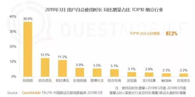 在具体的行业方面,短视频类应用总使用时长占比从去年的第 4 位上升至今年的第 1 位,综合资讯类应用也出现略微上升,从去年的第 3 位上升至今年的第 2 位,即时通讯类应用则从去年的第 1 位下降至第 3 位。