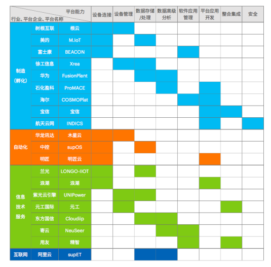 第一类是国内制造企业依托自身工业设备优势,孵化的工业互联网平台,代表企业有航天科工、三一重工、海尔、美的、富士康等;第二类是华为、徐工信息、宝信等,从传统系统解决方案商转向平台解决方案商;第三类是东方国信、用友、金蝶等工业软件企业;第四类是阿里、百度等互联网企业向工业领域扩展;第五类是优也、寄云等创业公司搭建的平台。