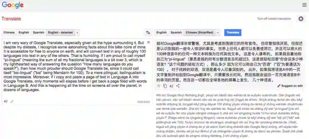 当然我承认,Google 翻译有时候给出的翻译确实看起来不错(尽管它们可能是有歧义或是完全错误的)。一整段或几个句子可能翻得相当不错,但这可能让人错误地认为 Google 翻译知道自己在做什么,知道什么是“阅读”。在这种情况中,Google 翻译似乎真的表现得很好——几乎像人一样!这当然归功于它的创造者以及他们的努力。但同时,不要忘了 Google 翻译在翻译上面两段中文以及法语和德语文章时的糟糕表现。