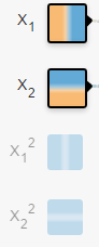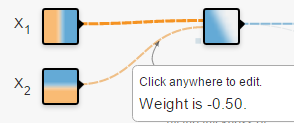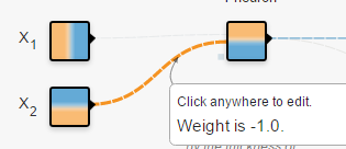 连接线:表示权重,蓝色表示用神经元的原始输出,黄色表示用负输出。深浅表示权重的绝对值大小。鼠标放在线上可以看到具体值。也可以更改。在(1)中,当把输出的一个权重改为 - 1 时,