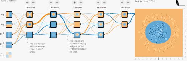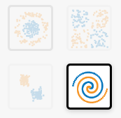 数据:在二维平面内,若干点被标记成了两种颜色。黄色,蓝色,表示想要区分的两类。你可以把平面内的任意点标记成任意颜色。网页给你提供了 4 种规律。神经网络会根据你给的数据训练,再分类相同规律的点。
