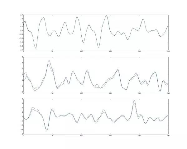 预测新值:训练过所有样本后,打乱样本顺序再次训练若干次。训练完毕后,当再来新的数据 input,就可以利用训练的网络来预测了。这时的 output 就是效果很好的预测值了。下图是一张实际值和预测值的三组对比图。输出数据是 48 维,这里只取 1 个维度来画图。蓝色的是实际值,绿色的是实际值。最上方的是训练数据的对比图,而下方的两行是神经网络模型从未见过的数据预测对比图。(不过这里用的是 RNN,主要是为了让大家感受一下效果)