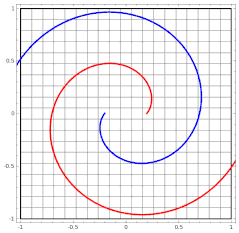 神经网络的解决方法依旧是转换到另外一个空间下,用的是所说的 5 种空间变换操作。比如下图就是经过放大、平移、旋转、扭曲原二维空间后,在三维空间下就可以成功找到一个超平面分割红蓝两线 (同 SVM 的思路一样)。