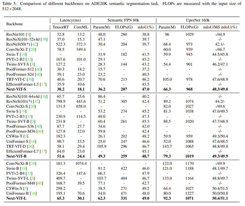 该研究将 Next-ViT 与 CNN、ViT 和最近一些混合架构针对语义分割任务进行了比较。如下表 5 所示,大量实验表明,Next-ViT 在分割任务上具有出色的潜力。