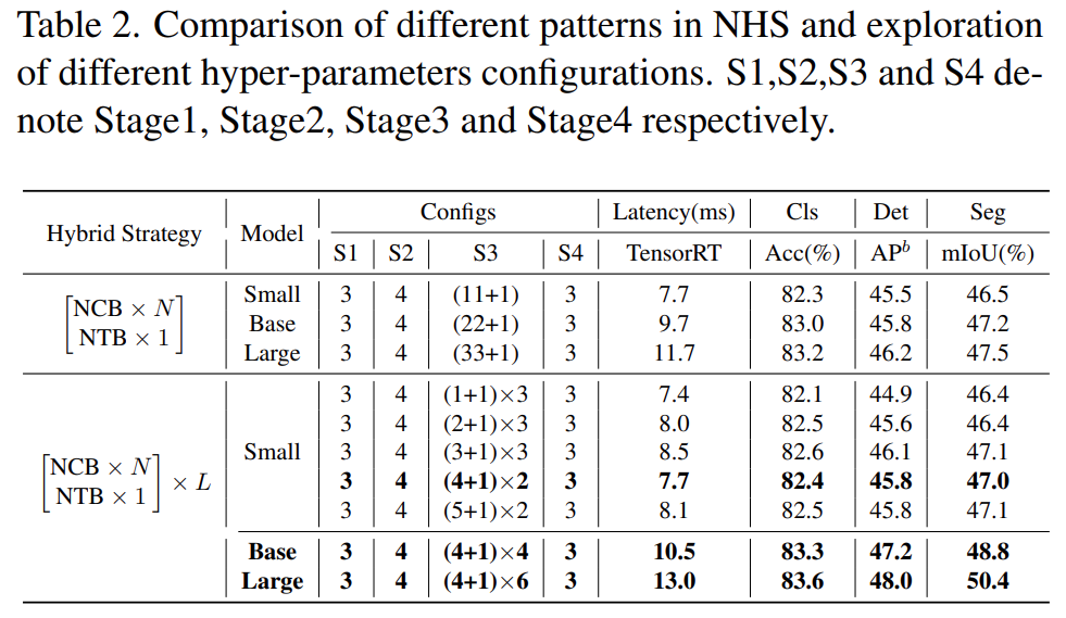 如表 2 所示,第三阶段 N = 4 的模型实现了性能和延迟之间的最佳权衡。该研究通过在第三阶段扩大 (NCB × 4 + NTB × 1) × L 模式的 L 来进一步构建更大的模型。如表 2(下)所示,Base(L = 4)和 Large(L = 6)模型的性能相对于小模型有显著提升,验证了所提出的(NCB × N + NTB × 1)× L 模式的一般有效性。