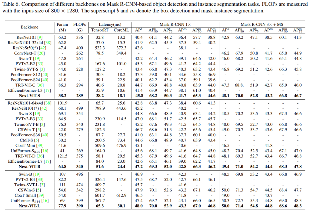 在目标检测和实例分割任务上,该研究将 Next-ViT 与 SOTA 模型进行了比较,结果如下表 6 所示。