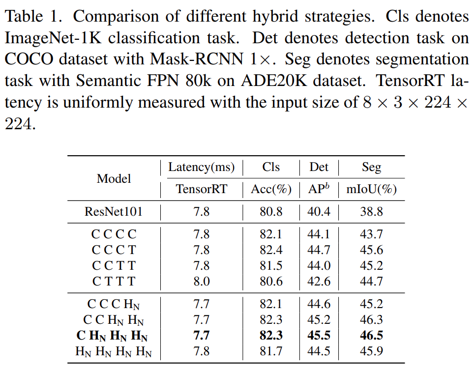 首先,为了赋予浅层捕获全局信息的能力,该研究提出了一种(NCB×N+NTB×1)模式混合策略,在每个阶段依次堆叠 N 个 NCB 和一个 NTB,如图 4(d) 所示。具体来说,Transformer 块 (NTB) 放置在每个阶段的末尾,使得模型能够学习浅层中的全局表征。该研究进行了一系列实验来验证所提出的混合策略的优越性,不同混合策略的性能如下表 1 所示。