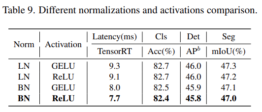 该研究进一步分析了 Next-ViT 中不同归一化层和激活函数的影响。如下表 9 所示,LN 和 GELU 虽然带来一些性能提升,但在 TensorRT 上的推理延迟明显更高。另一方面,BN 和 ReLU 在整体任务上实现了最佳的延迟 / 准确性权衡。因此,Next-ViT 统一使用 BN 和 ReLU,以便在现实工业场景中进行高效部署。