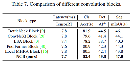 此外,一个高效的基于注意力的 token 混合器同样重要。该研究设计了一种多头卷积注意力(MHCA)作为部署卷积操作的高效 token 混合器,并在 MetaFormer [40] 的范式中使用 MHCA 和 MLP 层构建 NCB。
