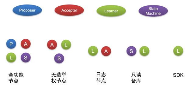 在经典的multi-paxos实现中,一般每个节点都包含了Proposer/Accepter/Learner三种功能,每一个节点都是全功能节点。但是某些情况下我们并不需要所有节点都拥有全部的功能,例如: