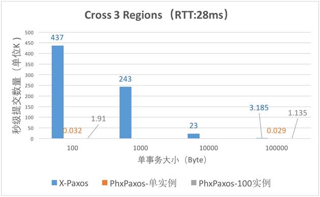 2. 跨Region场景下phxpaxos几乎不可用,而X-Paxos在444Byte(sysbench insert场景单请求大小),性能只有3.5%的下降,几乎不影响吞吐。