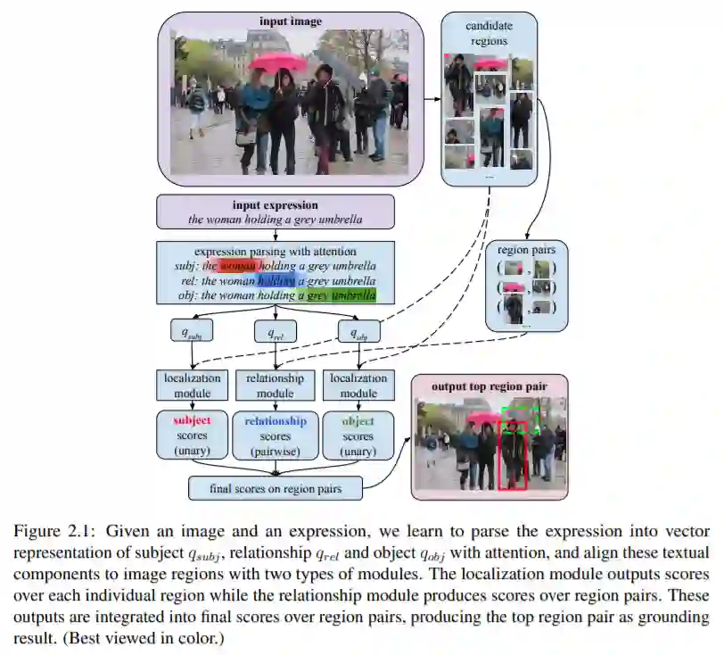 具体而言,该论文提出使用联合方法显式地对指示表达及其定位的组合语言结构建模,同时也支持对任意语言的解释。这里提出的 CMN 网络是一种端到端训练模型,可以联合学习语言表征和图像区域定位,如图 2.1 所示。