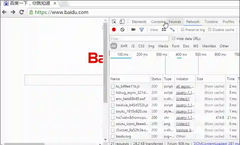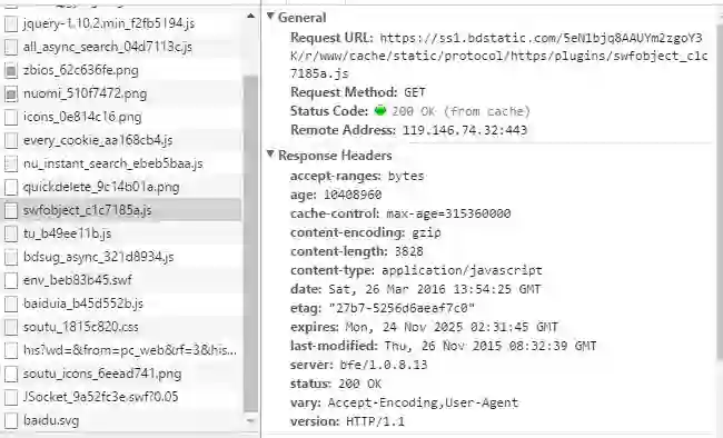 我们在访问百度首页的时候,会发现不管怎么刷新页面,静态资源基本都是返回 200(from cache):