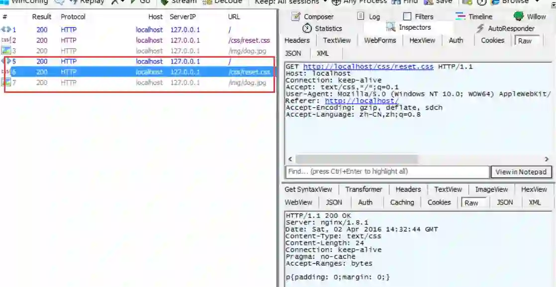 上图的前三条请求是原始请求,接着的三条请求是刷新页面后的新请求,在发新请求之前我们修改了 reset.css 文件,所以它的 Last-Modified 和 ETag 均发生了改变,服务器因此返回了新的文件给客户端(状态值为200)。