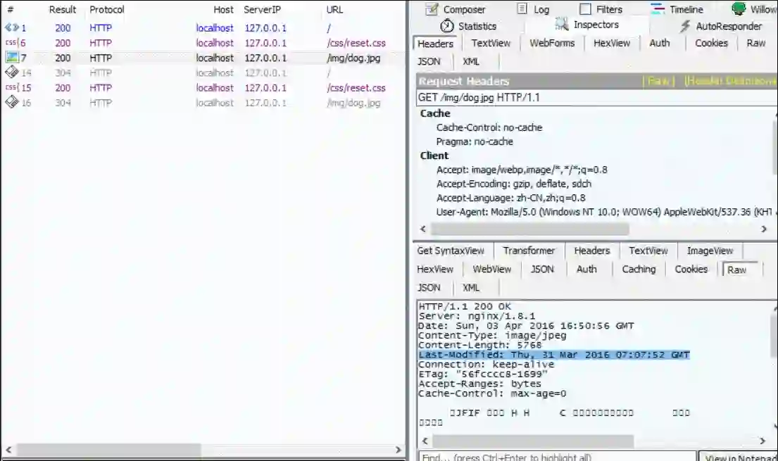 而 dog.jpg 我们没有做修改,其Last-Modified 和 ETag在服务端是保持不变的,故服务器直接返回了304状态码让客户端直接使用缓存的 dog.jpg 即可,没有把实体内容返回给客户端(因为没必要)。