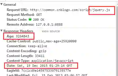 我们在上面那张博客园首页报文截图的同个场景下,看看某个文件(jQuery.js)命中代理服务器缓存的回包数据: