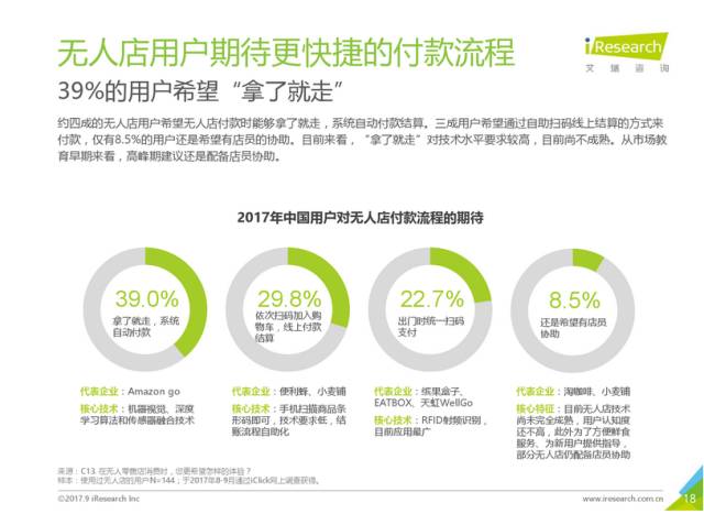 艾瑞报告显示:83%用户愿意体验无人零售消费场景,39%用户倾向支付不排队,方便快捷的购物体验。