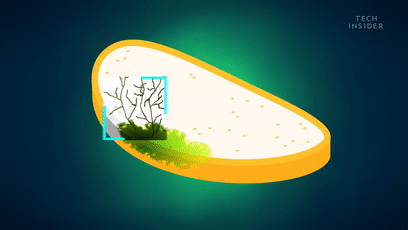 根据科技博主Science Insider的介绍,霉菌除了附着在面包的表面,还在其内部种下了一个根状网络,也就是说,其实你的发霉面包是长这样的: