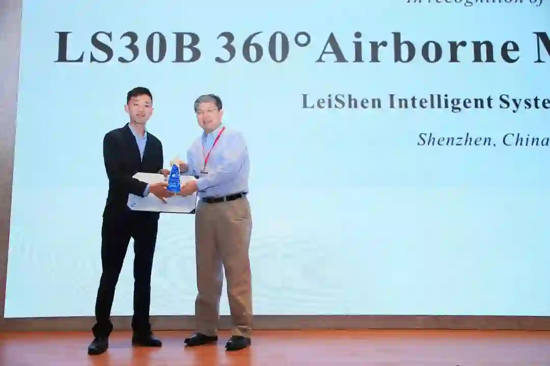 其中,LS30B系列机载测绘激光雷达由于其集轻量化与可靠性性于一体的优点,受到了国内外专家的广泛关注和认可,被一致推荐为本次大会的优秀产品金奖。大会闭幕式上,本次大会主席、深圳大学校长、国际欧亚科学院院士李清泉教授亲自为镭神智能颁发了奖杯和奖状。