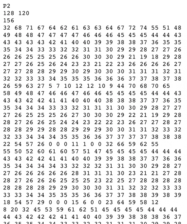 pgm是一个缩写,全称:Portable Gray Map。这是一种灰度图像格式,与常见的jpg格式相比,pgm不对数据进行压缩,因而体积较大。