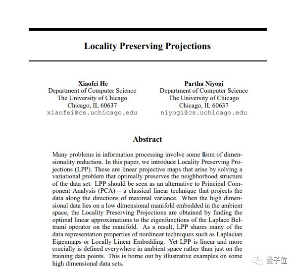 在这篇论文中,他们提出了保局投影(LPP)的算法,并利用数据集进行了证明。被引用了4000多次。这也是最早中标NIPS的中国籍学者论文。