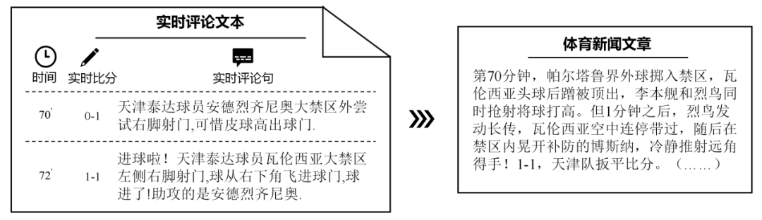 体育赛事摘要是一类特殊的文本摘要任务,旨在根据一场体育比赛的在线评论文本来生成对应的新闻报道。如下图所示,其中在线评论文本记录了整场比赛中解说员对当前赛事的实时讲解,平均长度高达2251.62字,且拥有口语化的特点。除此之外,每一句评论句还有对应的描述时间以及实时比分信息。而新闻报道则比较正规地记录了整场比赛的核心事件,能让人们更加方便、快速地回顾比赛。
