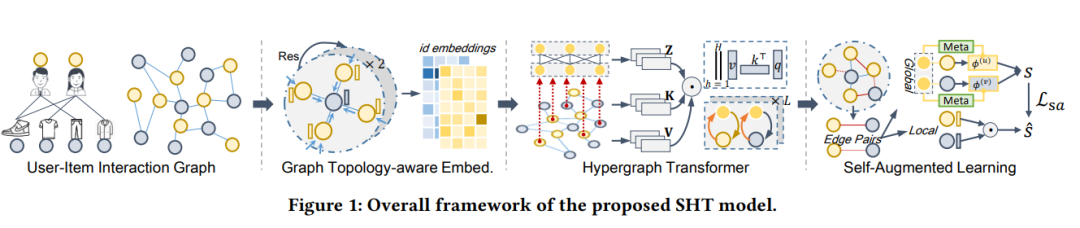 现有基于 GNN 的推荐系统的思想是递归地执行沿用户-商品交互边传递消息,从而得到相应的embedding。尽管它们很有效,但大多数当前的推荐模型都依赖于充足且高质量的训练数据,因此学习的表征可以很好地捕捉用户偏好。许多实际推荐场景中的用户行为数据通常是嘈杂的并且呈现出偏态分布,这可能导致基于 GNN 的模型中的表征性能欠佳。本文提出了 SHT,自监督超图Transformer框架 (SHT),它通过以显式方式探索全局协作关系来增强用户表征。具体来说,利用图协同过滤范式使用超图Transformer来维持用户和商品之间的全局协作效果。利用提炼的全局上下文,提出了一种跨视图生成自监督学习组件,用于在用户-商品交互图上进行数据增强,以增强推荐系统的鲁棒性。