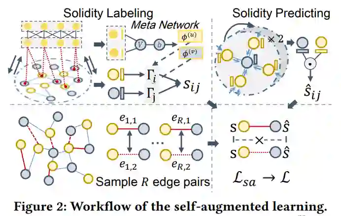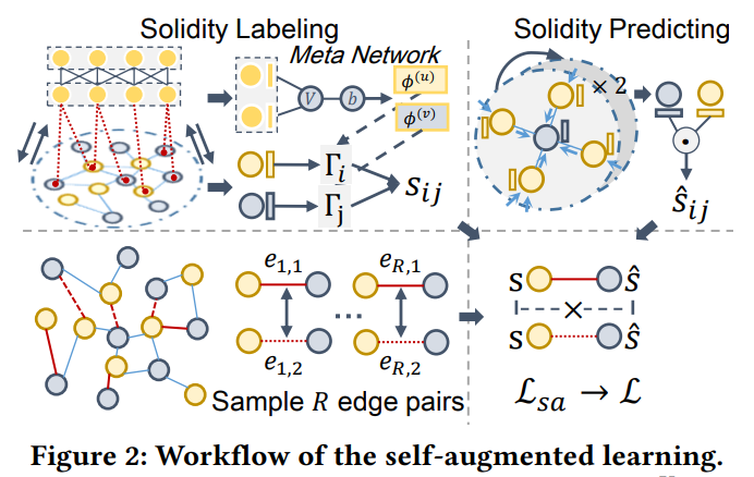 超图Transformer可以解决数据稀疏的问题,但是,用于局部协作关系建模的图拓扑感知embedding可能仍会受到交互数据噪声的影响。为了应对这一挑战,作者通过局部拓扑感知embedding和全局超图学习之间的自增强学习来增强模型训练。具体来说,用于局部信息提取的拓扑感知embedding增加了一项额外的任务,以区分观察到的用户-商品交互图中采样边的稳固性。这里,solidity 是指边没有噪声的概率,它在增强任务中的标签是根据学习到的超图依赖关系和表征来计算的。通过这种方式,SHT 将知识从超图Transformer中的高级和去噪特征迁移到低级和嘈杂的拓扑感知embedding,这有助于重新校准局部图结构并提高模型的鲁棒性。流程如图 2 所示。