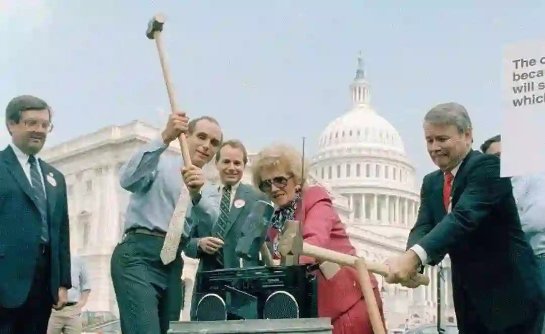 美国人顺藤摸瓜,于1987年初掌握了苏联从日本获取精密机床的真凭实据。美国朝野群情激愤,6月30日,5名美国国会议员站在国会山的台阶之上,面对电视摄像头,要求禁止进口东芝产品,并用长柄大锤砸碎了一台东芝牌录音机,东芝事件由此被推向舆论顶峰。(这张照片最近经常被用来当做日美半导体战的例子,实则是日本经济崛起大背景下冷战思维的产物)。