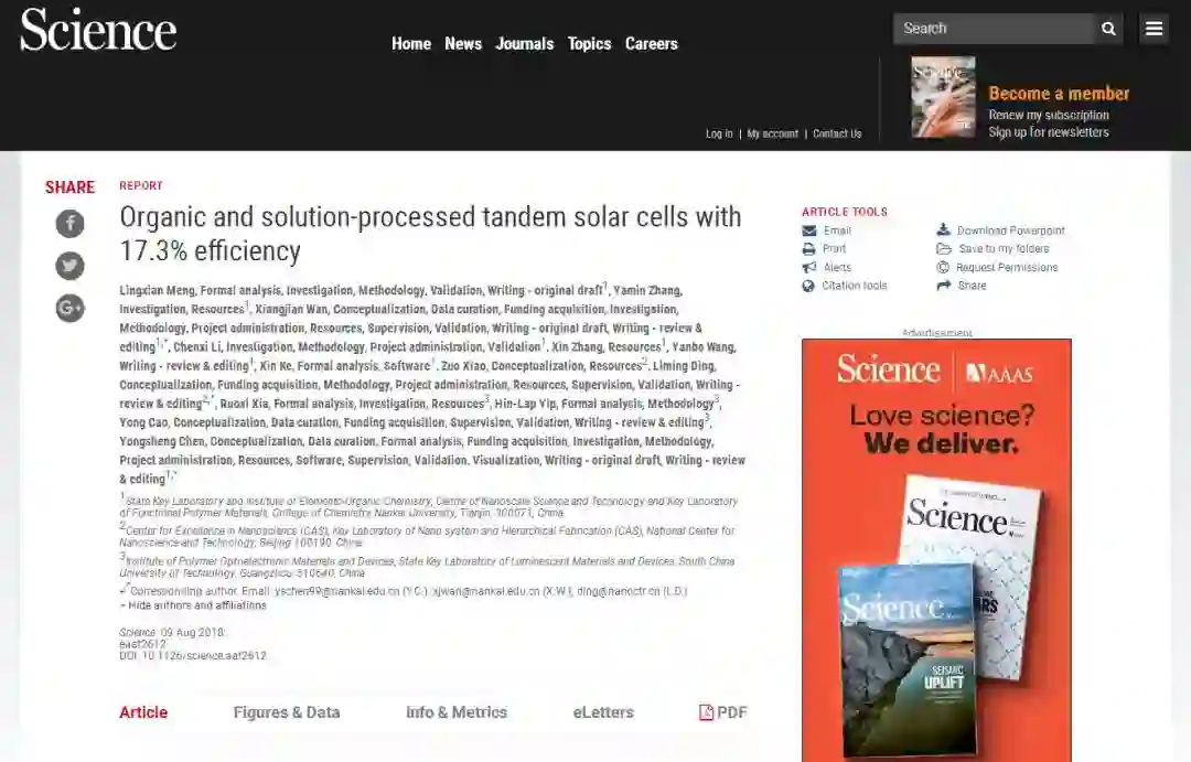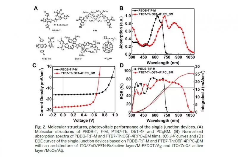 陈永胜教授团队与中科院国家纳米科学中心丁黎明教授、华南理工大学叶轩立教授研究团队合作,首先利用半经验模型,从理论上预测了有机太阳能电池实际可以达到的最高效率和理想活性层材料的参数要求。在此基础上,他们以在可见光区域和近红外区域具有良好互补吸收的PBDB-T:F-M和PTB7-Th:O6T-4F:PC71BM分别作为前电池和后电池的活性层材料,采用成本低廉与工业化生产兼容的溶液加工方法制备得到了高效的有机太阳能垫层器件,获得了17.3%的验证效率。