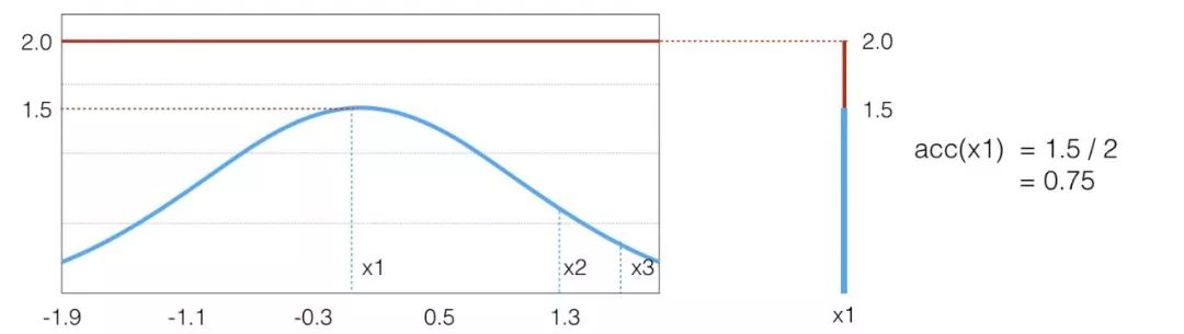 假设目标分布的 pdf 最高点是 1.5,有三个点它们的 pdf 值分别是