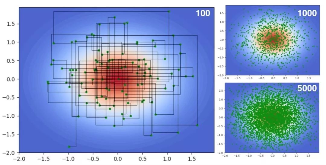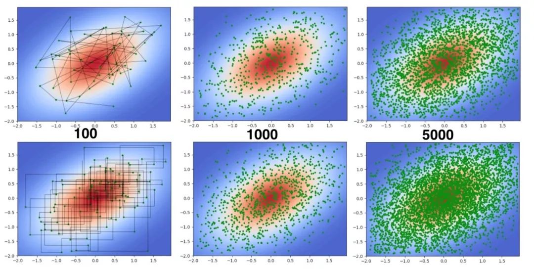 其转移的路径看到都是与坐标轴平行的直线,并且可以看到采样 5000 词的时候跟 Metropolis 相比密集了很多,因为它没有拒绝掉的点。