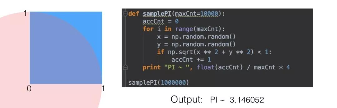 我们在学习随机模拟的时候通常会讲到用采样的方法来计算 π 值,也就是在一个 1×1 的范围内随机采样一个点,如果它到原点的距离小于 1,则说明它在1/4 圆内,则接受它,最后通过接受的占比来计算 1/4 圆形的面积,从而根据公式反算出预估的ππ值,随着采样点的增多,最后的结果  会越精准。