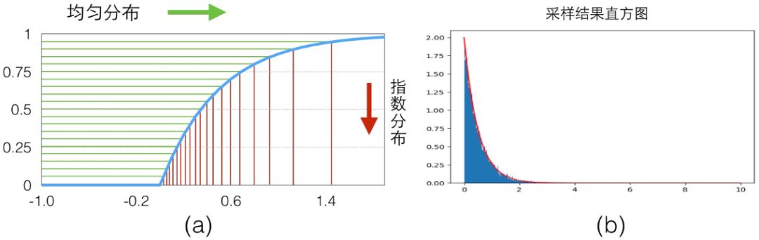 具体的映射关系可以看下图(a),我们从 y 轴 0-1 的均匀分布样本(绿色)映射得到了服从指数分布的样本(红色)。