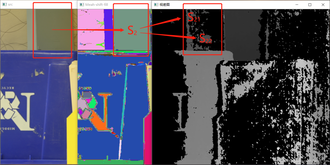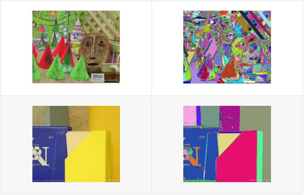 SGM作者采用Mean-Shift分割算法对影像进行分割,Mean-Shift是非常出名的图像分割算法,它的原理博主就不细说了,简单的说它把颜色相近的区域划分为同一子块,从而把图像分割成多个子块的算法。博主贴一些Mean-Shift的实验图同学们感受一下(来自opencv的meash-shift算法):