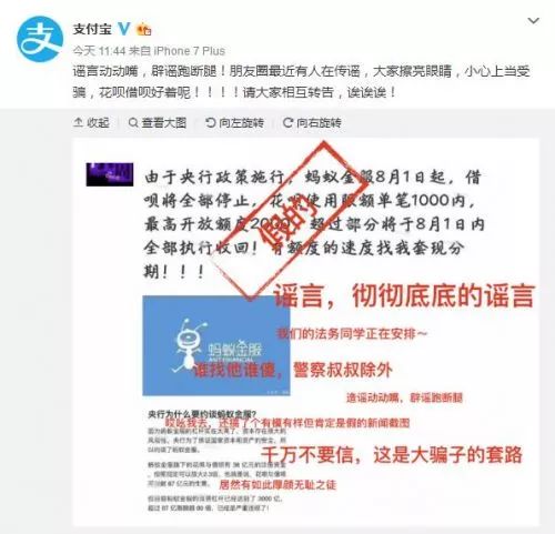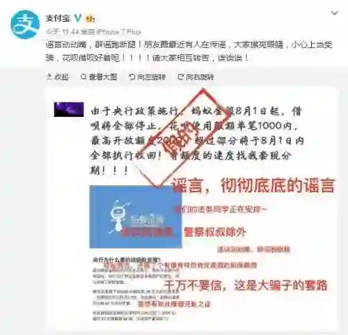 近日朋友圈有谣传称蚂蚁金服8月1日起,借呗将全部停止,花呗使用限额单笔1000内,最高开放额度2000,超过部分将于8月1日内全部执行收回。