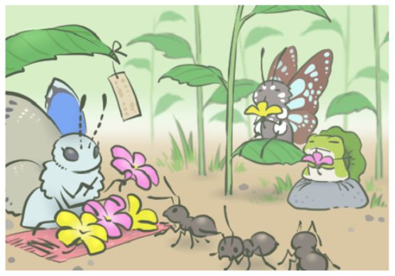 接下来这张明信片让人有点捉急,我们能看得到这只蝴蝶头部为白色、翅膀正面是蓝色、边缘黑色,符合这些特征的灰蝶还不少,毕竟翅膀背面被挡住了,让我们少了很多鉴定依据。它在售卖酢浆草的花,让人心里难免偏向幼虫寄主为酢浆草的酢浆灰蝶(Pseudozizeeria maha),但酢浆灰蝶翅膀的斑纹与明信片上所描绘的不太符合。从日本的分布和依稀可见的背面来看,我趋向于蓝灰蝶。这真是一个纠结的选择,但总之是灰蝶科的成员妥妥的。