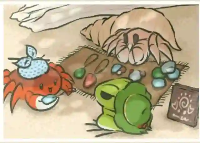 而得到这张明信片的蛙妈,可以说是欧皇中的欧皇了。这里的明信片是由豆瓣上的“窝头大战包子腿”友情提供,这也是目前第一次看见有人收到这张明信片。第一眼看见这张的时候,我就被萌哭了——那个背着螺壳的护身符摊老板就是陆寄居蟹。陆寄居蟹和其他寄居蟹一样,都不属于螃蟹,属于十足目歪尾下目(螃蟹是短尾下目)。它们的眼睛是四方柱形或圆柱形,十分可爱。和其他寄居蟹一样,陆寄居蟹也会换壳,会在近海的陆地上找其他死螺的二手房使用。