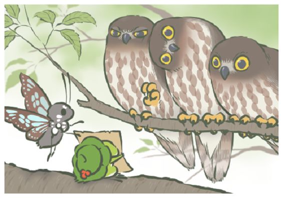北鹰鸮是从原来的鹰鸮(N. scutulata)中分离出来的具有迁徙习性的种群,生活在东亚北部,包括日本。它们是一种中型猛禽,是个“圆寸头”,没有显著的面盘和耳羽簇的家伙。它们和其他猫头鹰一样喜欢晚上活动,捕食昆虫、小鼠等。它们眼睛的虹膜是黄色,嘴灰黑色,腹部白色有灰斑纹,所以还是比较好锁定目标的。值得一提的是,猫头鹰的脚有四个脚趾,第四趾是转趾足,可以前后转动,从普通的三趾向前,一趾向后变成脚趾变成两前两后,方便以便抓紧猎物和树枝。这张明信片很难得地把这个脚趾也画对了,令人感动。