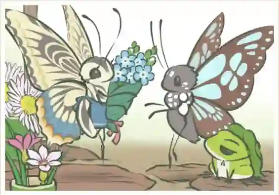 有一张稀有明信片里出现了卖花的柑橘凤蝶,这种凤蝶也叫花椒凤蝶,因为它们的幼虫主要取食柑橘属和花椒属植物的叶子。柑橘凤蝶广布于亚洲,和另一个常见种金凤蝶长相接近。区别特征之一就是柑橘凤蝶的前翅中室有明显黑黄相间的条纹,在明信片里也有画出来呢。