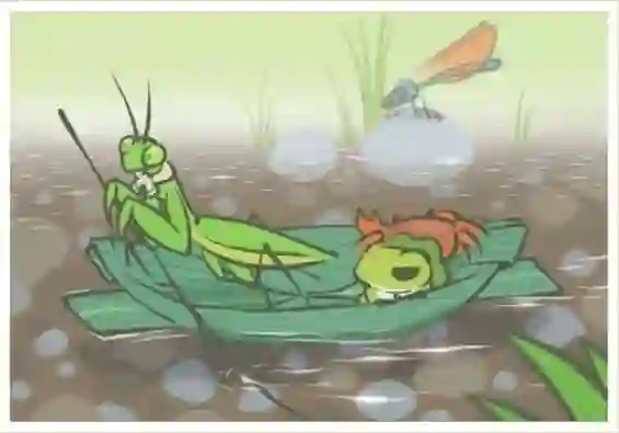 广斧螳也是日本和中国都很常见的螳螂之一,体型中到大型,因为肚子很大很宽,又称为广腹螳螂。广斧螳通常是绿色的,也有褐色、棕色等其他色型。前足就是螳螂科都有的捕捉足,总之明信片画得也是蛮接近实物的。