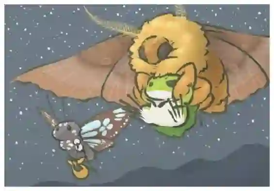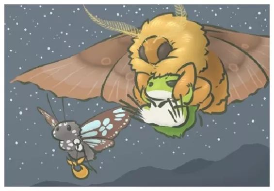 据说用价值3000三叶草的摇铃和一堆值钱的装备才能换来的超稀有明信片!明信片里面有一只拉着青蛙飞的大蛾子。从体型和斑纹看,比较接近就是大蚕蛾科的柞蚕蛾,我是从前后翅背面有几个圈的斑纹判断的,翅展5~6厘米也符合,反正比蛙大。这个种在亚洲分布也很广,有些地方还拿它们的蛹炒着吃,柞蚕茧也可缫丝,丝绸产量仅次于家蚕。