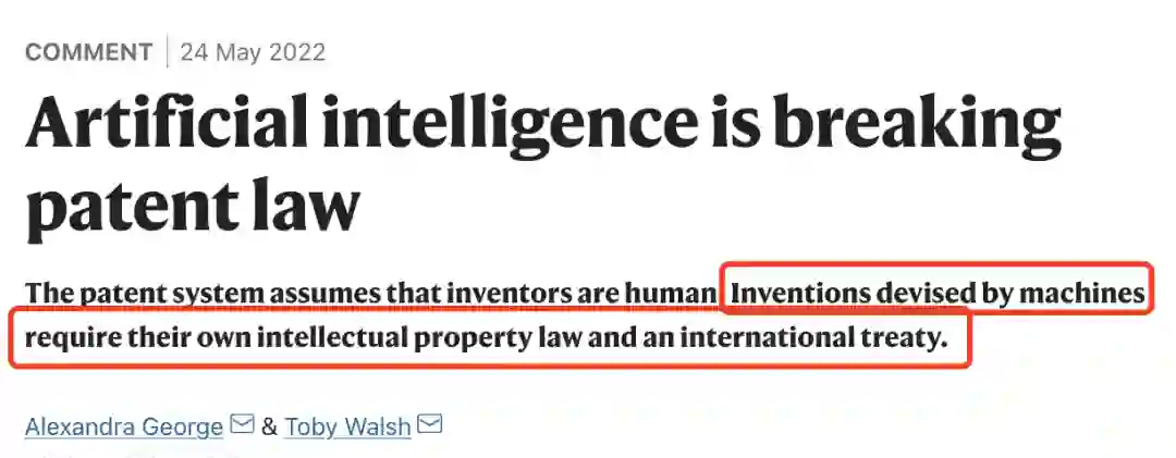 最近,来自澳大利亚新南威尔士大学的两位作者在Nature发表评论文章,称世界各地的政府都应为人工智能设定知识产权法,为它们提供申请专利的权利。