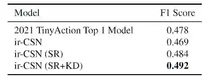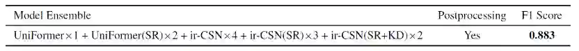表中ir-CSN表示用低分辨率数据直接训练得到的模型,ir-CSN(SR)表示用超分辨率后的数据训练得到模型,ir-CSN(SR+KD)指的是用高低分双模态模型蒸馏机制训练得到的模型。ir-CSN(SR+KD)模型取得了最佳的提交结果,在单模型上比去年的最佳方案提升了1.4%。