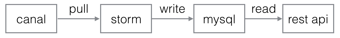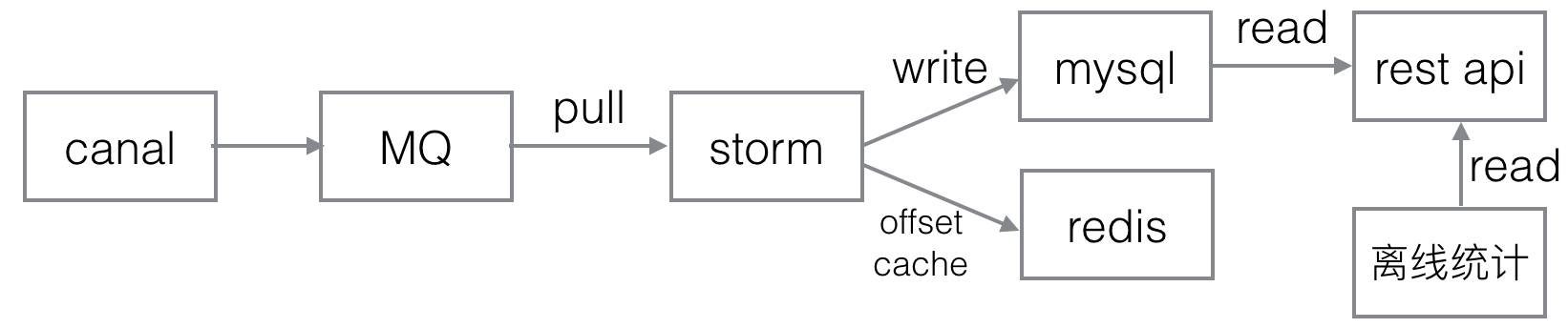 随着统计应用拆分,在canal和storm应用之间加上消息队列。canal不支持多消费者,而实时统计业务也不用关系数据库底层迁移、主从切换等维护工作,加上消息队列能把底层数据的维护和性能优化交给更专业的团队来做。
