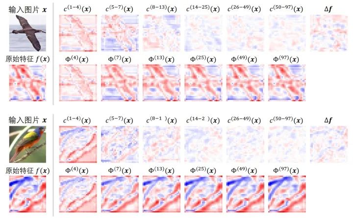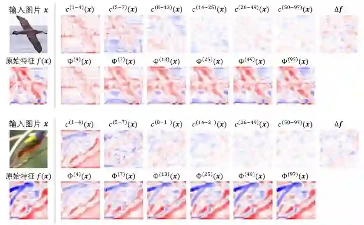 将神经网络中层特征解构并可视化出不同复杂度的特征分量: 神经网络从输入样本中抽取得到了非常丰富的特征,而这些特征既包含简单的特征分量,也包含复杂的特征分量。简单的特征分量往往经过简单的变换就能得到,例如通过一个较浅的神经网络,而复杂的特征分量则需要较深的神经网络才能拟合。即,给定一个训练好的神经网络 ,和输入 ,其中层特征 中包含了不同复杂度的特征分量: