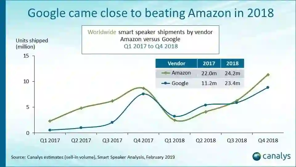 Google和亚马逊在智能音箱领域的较量,让二者的领先地位交错上升。2018年Canalys数据显示,2018年第一季度,亚马逊共售出250万台Echo智能音箱,市场占有率为27.7%,同比下滑了51.9%。而谷歌则售出了320万台Google Home智能音箱,市场占有率达到了36.2%,这是谷歌第一次在智能音箱出货量方面超越老大哥亚马逊。不过2018年Q3,亚马逊又实现对Google的反超。