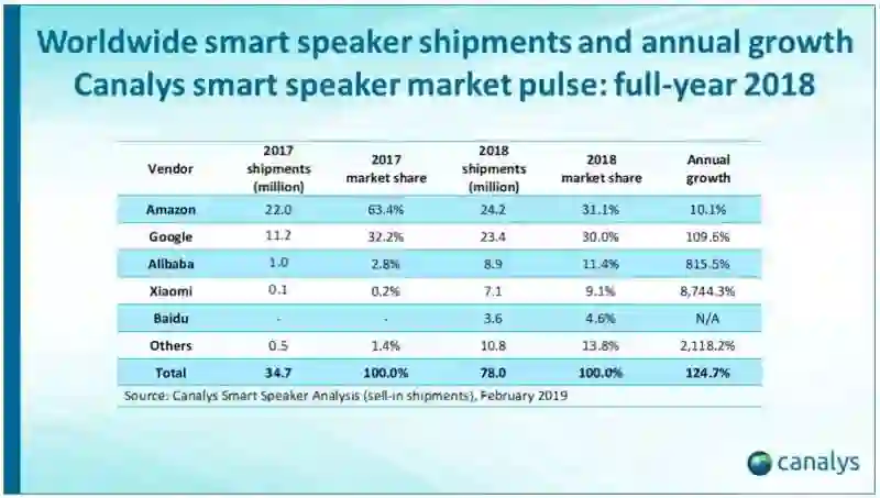 两年前很多人还判断智能音箱是「科技玩物」,近两年智能音箱发展境遇却是另一番模样。据研究分析师Canalys称,智能音箱2018年全球出货量达到7800万台,与2017年的3470万台相比,增长率达到惊人的125%。受到市场鼓舞后,巨头在智能音箱领域也玩起了自创风口的打法,软件服务免费,硬件补贴的策略,智能音箱的行业竞争在2019年备受关注。