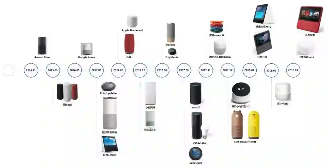 时间转瞬来到2017年,这时巨头纷纷推出智能音箱,希望成为语音交互入口平台。智能音箱行情又变成国内风口行业常出现的千团大战、千播大战的局势,BAT、小米等互联网巨头企业和很多创业型企业杀入市场。