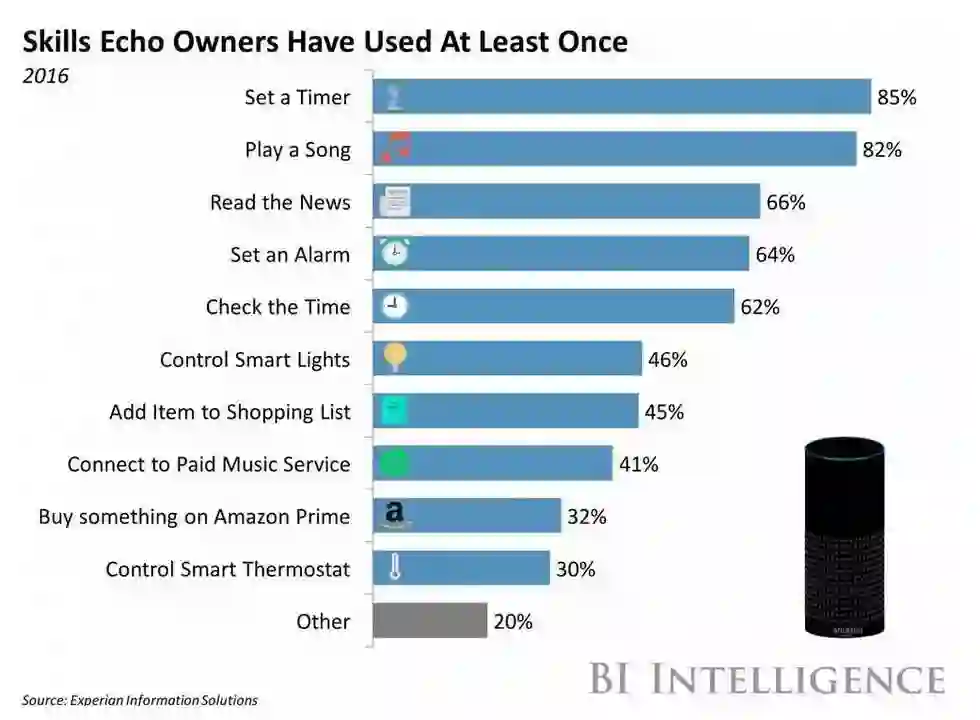 最初Echo是为家庭打造的智能音乐播放器,而且首批产品是带遥控器的。从这张图中也可以看到,时间提醒、听歌、读新闻等基础休闲娱乐功能是最主流的需求。